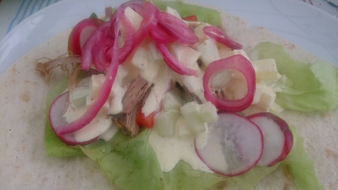 Allt serverades med creme fraiche med smak av chili och paprika samt en sallad.